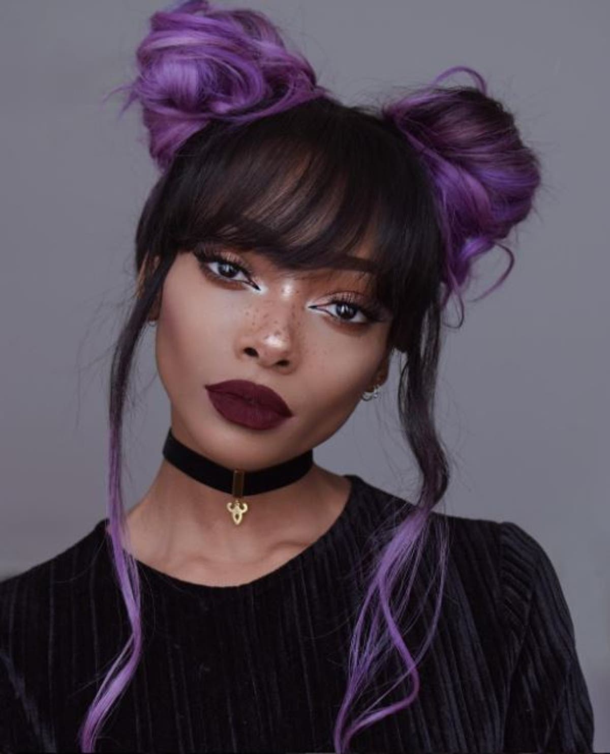 Para quem deseja um visual mais discreto e pouco chamativo, uma boa opção é fazer apenas algumas mechas roxas no cabelo, mantendo o restante dos fios na coloração natural ou o mais próximo dela.