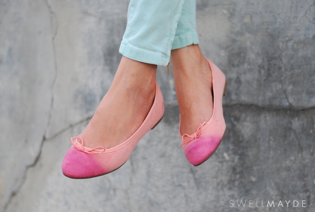 Para essa técnica a sapatilha deve ser branca de cetim, camurça ou algodão. Em um recipiente coloque água para ferver de preferencia meio litro e acrescente 3 colheres de sopa de tinta na água. A cor da tinta você escolhe. Coloque a parte dianteira da sapatilha na água e deixe alguns minutos, tire e coloque novamente só que desta vez rapidamente afundando um pouco mais para dar um efeito degrade! Para finalizar use o pincel de esponja passe a tinta sobre o corante, de outra cor diferente da que você já usou, com o pincel de esponja. Deixar uma parte de cerca de ou dois centímetros sem pintura. Depois, coloque o pincel de esponja debaixo d’água até que esteja totalmente limpo. Molhe na água o pincel e pinta por cima para suavizar o modelo ombré.