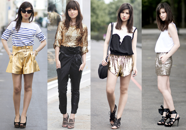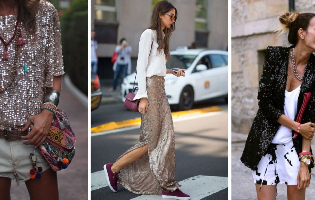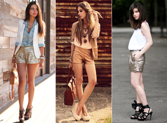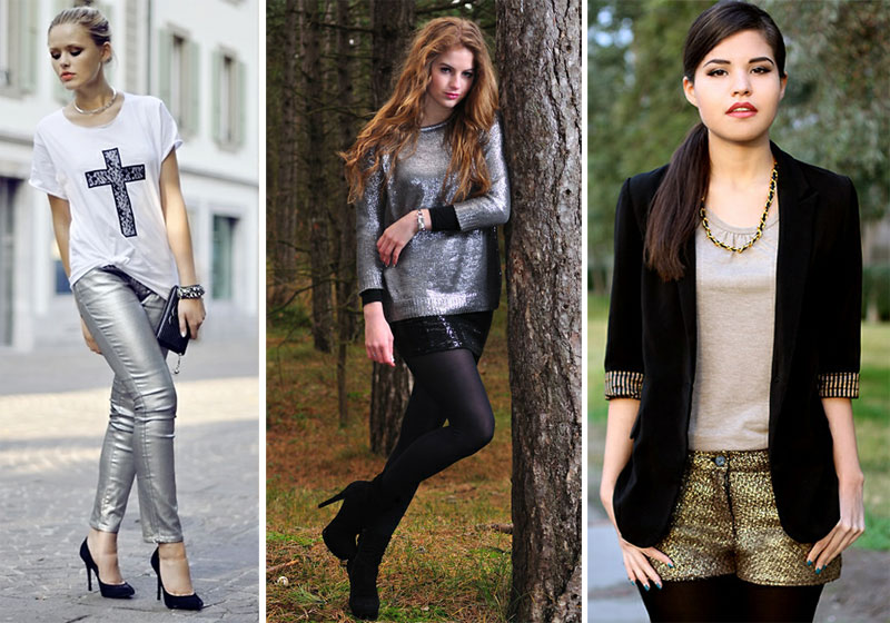 Primeira regra importante que deve ser seguida sem hesitar, quando optar por usar brilho durante o dia é importante combinar com peças em cores nude e claras. Portanto se o brilho for combinado com cores escuras automaticamente o look não será mais apropriado para o dia, mas sim para a noite. As calças metálicas voltaram e são ótimas opções, sem falar que estão na moda, mas para ficar bem devem ser combinadas com camisas proporcionando um ar um pouco mais formal ao look e é ideal para trabalhar. Os shorts em dourado ou trabalhos no paetê também estão liberados além de estarem muito na moda, podem ser combinados com blusas mais soltinhas em tons pastel. Os casacos também podem ser usados durante o dia, porem eles devem ser a única peça com brilho do look para não ficar exagerado demais.