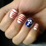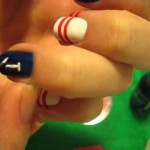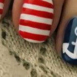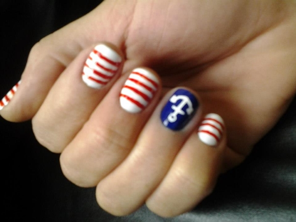 – Com o esmalte vermelho faça uma mini ancora no dedo anelar por cima das listas.